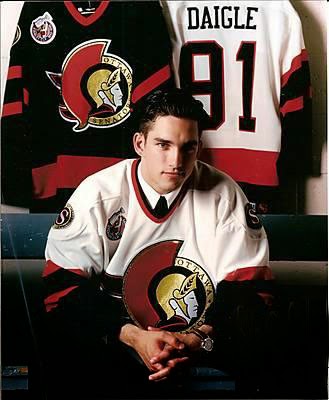 Mais ces cartes ne me font pas le même effêt car quelque chose cloche sur chacune d'entre elles. Tous ces joueurs n'étaient pas avec leur équipe en 1992-93 et n'auraient pas pu porter cette patch sur leur chandail. Alexei Yashin jouait toujours en Russie, Alexandre Daigle, premier choix au repêchage de juin 1993 était encore dans le junior avec Victoriaville. Même chose pour Chris Pronger, choisi au 2ème rang derrière Daigle. Quant à Troy Mallette, il joua la saison 1992-93 avec les Devils. Pourquoi donc on retrouve la patch du 100ème sur leurs chandails? On ne peut pas parler d'erreur de "airbrushing" comme les cartes des années 70 et 80. J'ai vérifié et la patch ne fut pas portée pour la portion 1993 de la saison 93-94. Ma seule théorie est que ces photos ont été prises lors d'un match pré-saison entre les Whalers et les Sénateurs et que les préposés à l'équipement n'avaient pas encore fait les ajustements nécessaires. Mais sur la carte d'Alexandre Daigle, il porte un chandail blanc alors que les autres portent le noir. Il s'agirait donc de plus d'un match où cette patch fut portée illégitimement.