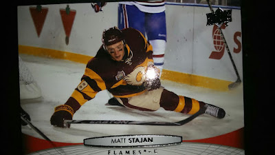 Pourquoi ne pas poursuivre dans la lignée du billet de Mathieu cette semaine et y aller avec d'autres cartes Upper Deck dont la photo est un joueur qui se plante. Aujourd'hui, des cartes de la série Upper Deck 2011-12 provenant d'une boîte que j'ai achetée il y a quelques années lors de la vente trottoir de la pharmacie en dessous d'où se situe mon bureau. Vous m'excuserez les flash sur les cartes, j'ai pris les photos avec mon cellulaire et non avec mon scanner comme d'habitude...