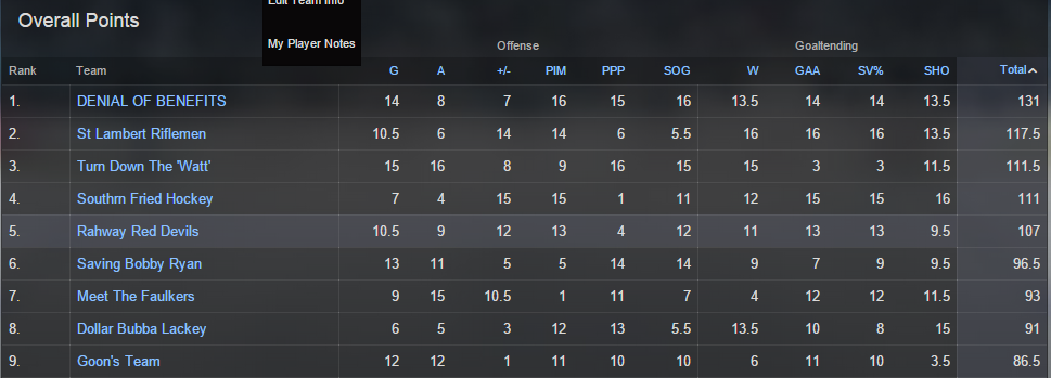That’s right! The THW Hockey League will get its very own snapshot of sorts. We will take a look at as much as humanly possible. This means everything from points to teams on the way up, down, sideways, and more. So did you want an example? Here you go!