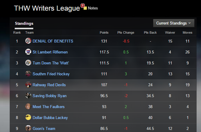 Keep in mind, that the season is going to get really tight after the All Star Break. There is still a good amount of movement to be had among the top half of the league. Money spots definitely are not sealed fantasy hockey fans….not even the top spot just yet.