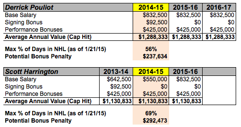 If Pouliot were to spend the rest of the season in the NHL and achieve all possible bonuses, I calculated that the team would be faced with a $237k penalty next year. For Harrington, that number is $292k.