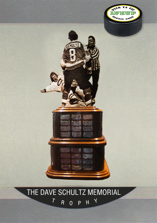 Encore une fois cette année, La Vie Est Une Puck est très fier de vous présenter le Dave Schultz Memorial Trophy remis annuellement au joueur ayant accumulé le plus de minutes de pénalités durant la saison régulière. Si comme moi vous vous ennuyez du temps où les meneurs au chapitre des minutes de pénalité avaient droit à une carte de hockey soulignant cet exploit, voici votre revanche. Ce trophée porte donc le nom de celui qui détient toujours le record de minutes de pénalité en une saison dans l'histoire de la NHL, Dave "The Hammer" Schultz. Ce grand matamore des Broad Street Bullies passa 472 minutes au banc de pénalité lors de la saison 1974-75, deuxième année où les Flyers remportèrent la Coupe Stanley à coups de dents pétées et de côtes arrachées! Ce n'est donc pas un enfant de chœur qui se mérite ce trophée!