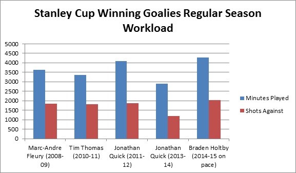 Below is a chart of recent Stanley Cup winning goaltenders who were the starter for their team throughout the regular season prior to the Stanley Cup playoffs. On the right side is Holtby’s on pace statistics on NHL.com, where he is the leader of this group. He’s on pace for over 2,000 shots faced and over 4,000 minutes in net.