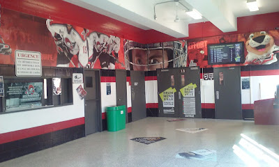 Il y a deux billetteries au Centre Marcel-Dionne. C'est la première fois que je voyais ce phénomène. Deux entrées, donc deux fois plus de choses à regarder. La première billetterie, celle qui donne sur le stationnement, nous montre bien que nous sommes dans le domicile des Voltigeurs. Murs peints aux couleur de l'équipe, posters muraux de l'équipe ainsi qu'une photo de la mascotte de l'équipe, Tirobut !