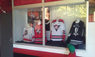 La deuxième billetterie, celle qui donne sur la rue Cockburn, contient beaucoup plus de choses à regarder. Tout d'abord, il y a un tableau relatant la glorieuse carrière de Marcel Dionne, enfant de Drummondville, né en 1951. Il y a aussi les différentes plaques indiquant l'année d'inauguration du "Centre Civique" et du "Centre Marcel-Dionne". Ce que j'apprécie beaucoup, c'est la vitrine avec quelques chandails des Voltigeurs. Bien sur, ils ne sont pas tous représentés, les Drummondvillois ayant portés 8 uniformes (local et visiteur + celui des 30 ans) dans leur histoire de 36 saisons. Je rêverais de voir la même chose au domicile des Tigres. Je devrais peut-être leur faire la suggestion, j'ai des chandails que je pourrais leur prêter ...