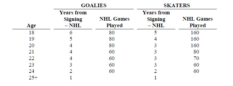For 20-year-old players (either skaters or goalies), playing in one professional game will count as the first year of their exemption. For 25-year-old players (either skaters or goalies) playing one professional game will only be exempt for the remainder of that season.