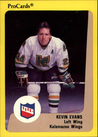 Il débuta ensuite à temps plein à Kalamazoo en 1986-87 et ce fut une saison pour la légende. En 73 matchs, Evans récolta effectivement pas moins de 648 minutes de pénalité. Ici ça vaut la peine de l'écrire au complet... Une moyenne de 8,7 minutes par match au cachot. C'est un total assez impressionnant malgré que c'était bien sûr durant ces folles années 80 mais à ma mémoire je n'ai pas souvenir d'avoir vu un autre joueur dans les 600 minutes. J'ai quelquefois vu 500 et quelques 400 dans la LNH mais 600 c'est une première dans toutes mes années de recherche.