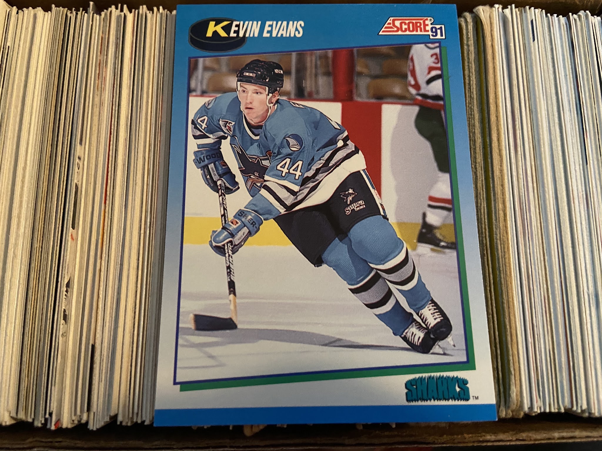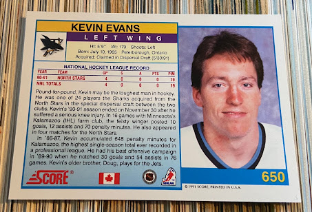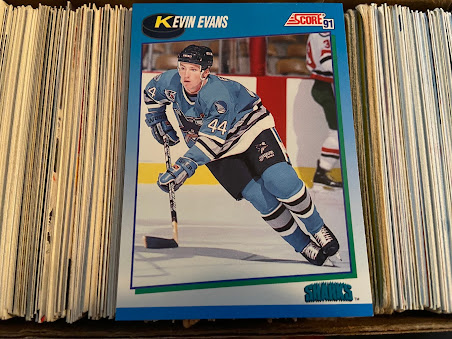 En plus de cette série, j'essaie d'avoir le plus de cartes possible des joueurs de la première saison des Sharks en 91-92, (processus que j'ai ensuite répété pour toutes les équipes d'expansion récentes). J'ai donc beaucoup de Kelly Kisio et de Rob Zettler mais je n'avais jusqu'à maintenant aucune carte de Kevin Evans, lui qui ne joua qu'une poignée de matchs dans la LNH et qui n'était même pas dans les 10 joueurs de la série d'O-Pee-Chee.