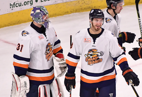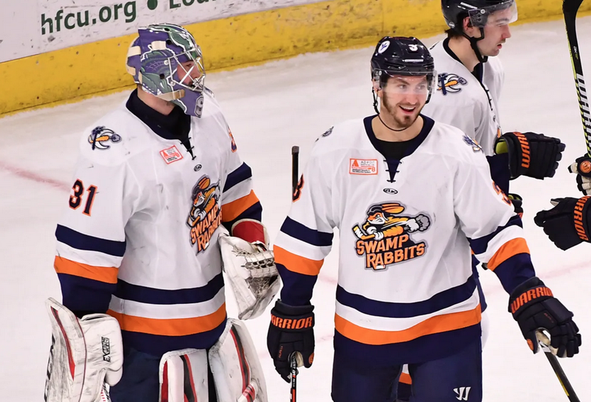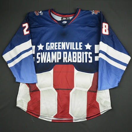 J'adore ce logo et tout le reste. Particulièrement la carrotte en forme de bâton... Et contrairement à ce qu'on peut croire en voyant le chandail, ils ne sont pas affiliés aux Islanders mais plutôt aux Panthers. Les Road Warriors changèrent de nom en 2015 et firent la joie de tous et chacun en adoptant le sobriquet «Swamp Rabbits». Le nom fait référence à la «Swamp Rabbit Trail», un sentier ferroviaire de la région datant de 1920 et qui lui est nommé en honneur d'une espèce de lapin «aquatique» du sud des États-Unis, le Sylvilagus Aquaticus, un mammifère terrestre amphibien... Quand je dis qu'on en apprend tous les jours.